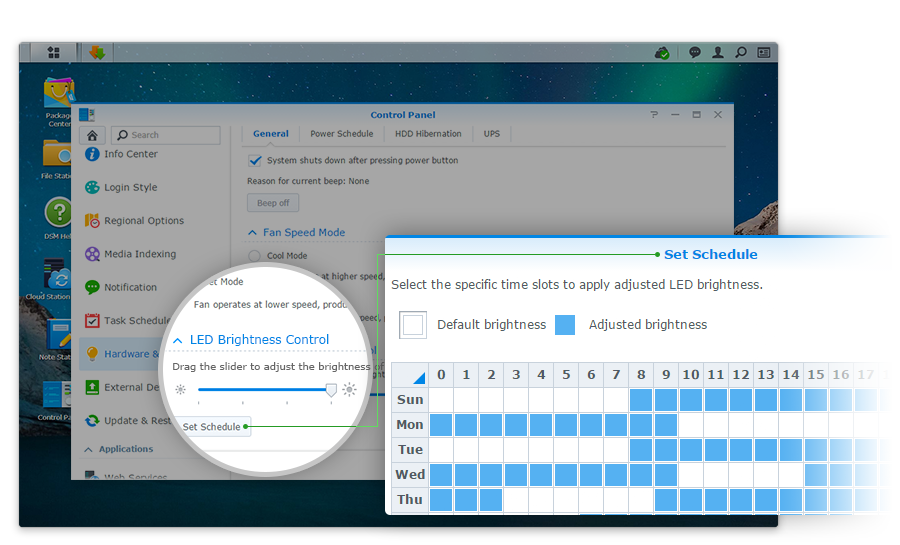 DS216j 配備可調(diào)整亮度的 LED 指示燈,讓你可以針對前方面板的 LED 燈進行四種明暗度及排程設(shè)定,根據(jù)所處環(huán)境決定舒適的亮度。