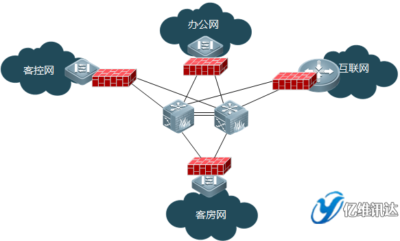 通過銳捷核心交換機的防火墻模塊的虛擬防火墻功能,對客控網(wǎng)、客房網(wǎng)、辦公網(wǎng)進(jìn)行安全防護(hù),將病毒/攻擊隔離在本地,不影響其他區(qū)塊正常運行。